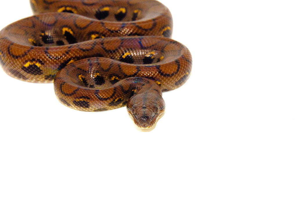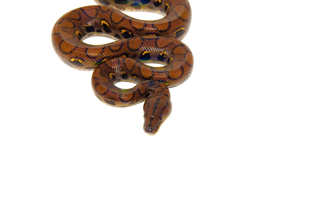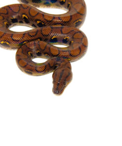 - This alluring Brazilian Rainbow Boa has an iridescent skin which refracts light in a rainbow-colored effect. The tiny ridges on the scales act as prisms to give off this beauty of colors! Brazilian Rainbow Boas are brown or reddish with three black lines crossing the top of their head.