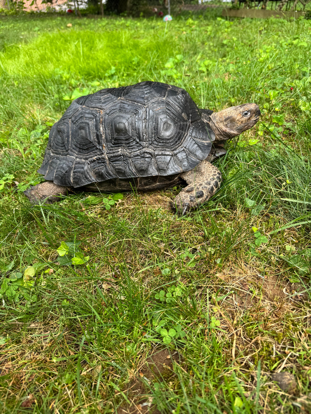 Her scaly, textured legs and strong claws are perfect for navigating mountainous or rocky terrain, reflecting her natural habitat. This black tortoise for sale has a calm and regal demeanor, combined with her rare coloration, which makes her a standout specimen for display and breeding purposes.